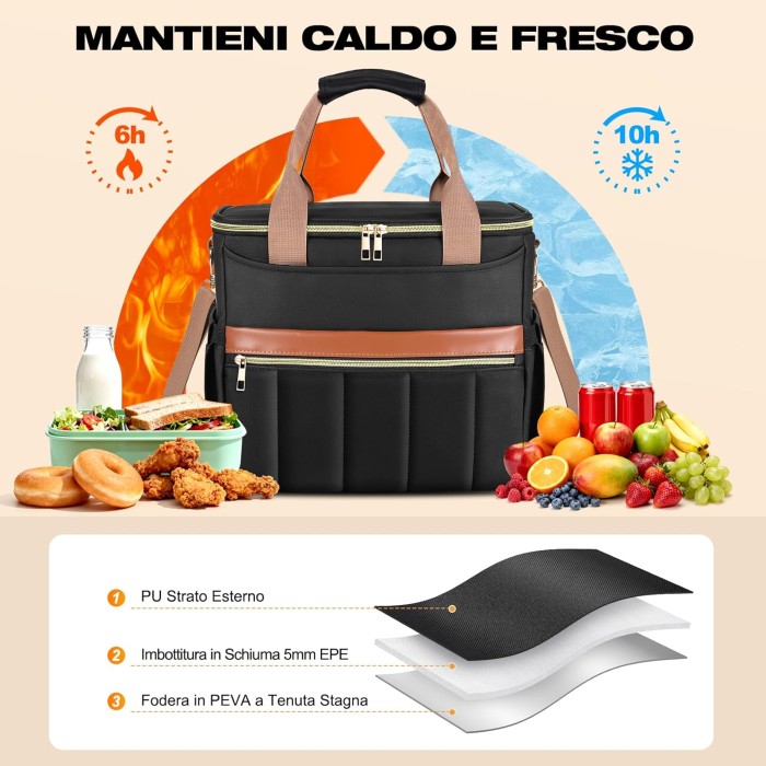 - 【Isolamento Duraturo & Design Impermeabile】La borse termiche porta pranzo è dotata di un sistema di isolamento a tre strati: un guscio impermeabile rivestito in PU, schiuma EPE da 5 mm e un rivestimento in PEVA di grado alimentare, 100% impermeabile e facile da pulire. Con un isolamento potenziato del 30%, mantiene il cibo freddo fino a 10 ore o caldo fino a 6 ore, assicurando pasti freschi ovunque. (Suggerimento: utilizzare con sacchetti di ghiaccio per il massimo raffreddamento)